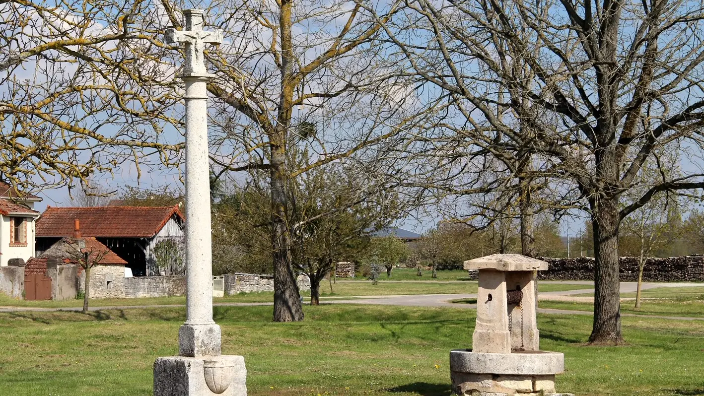 Ce calvaire, daté du XVIIe siècle, montre sur une face un Christ de facture naïve, et