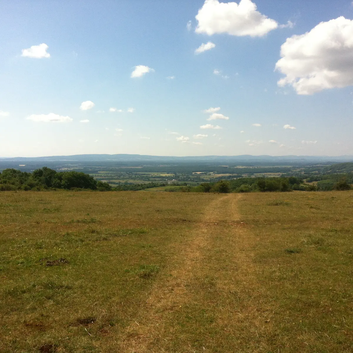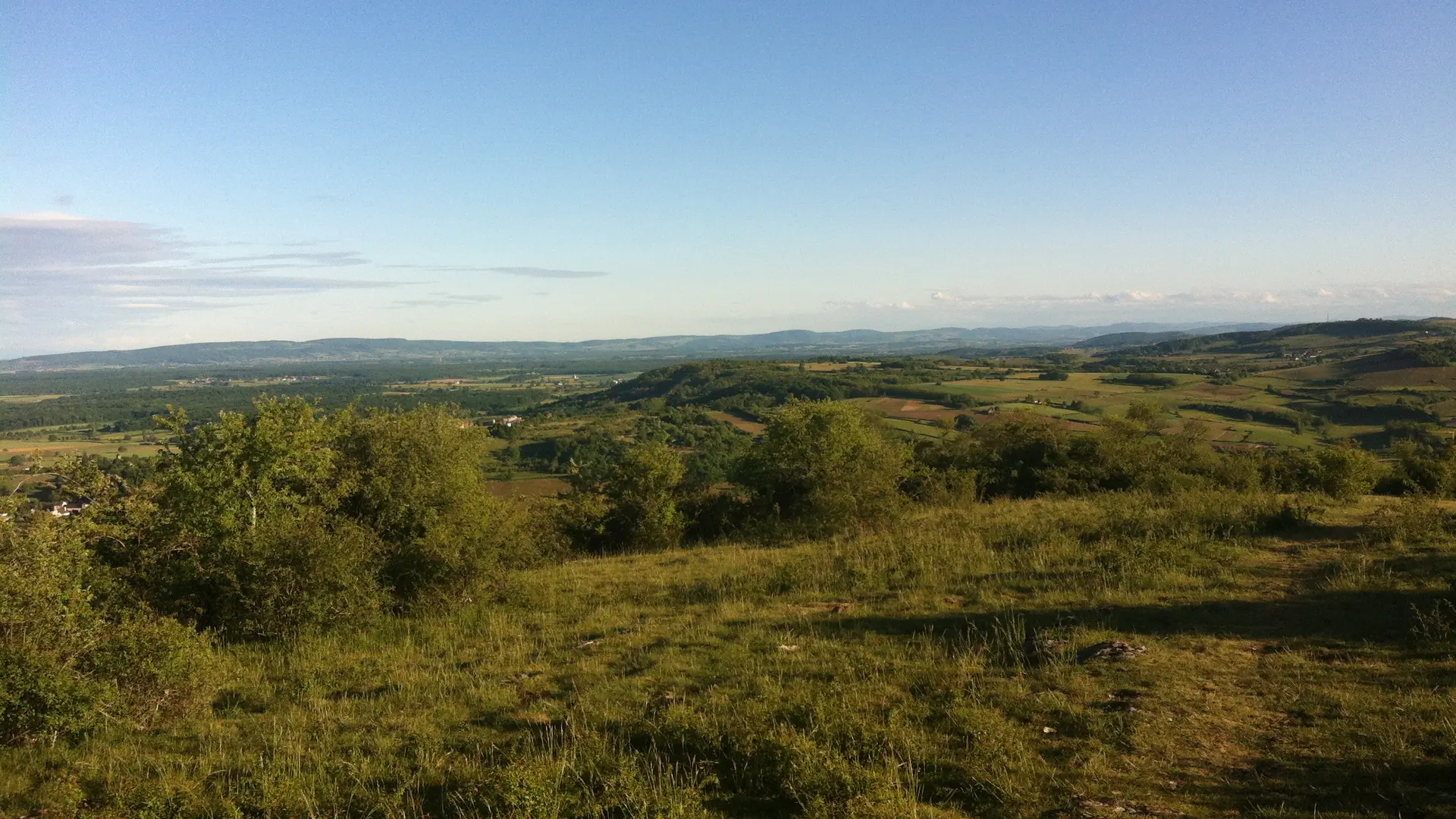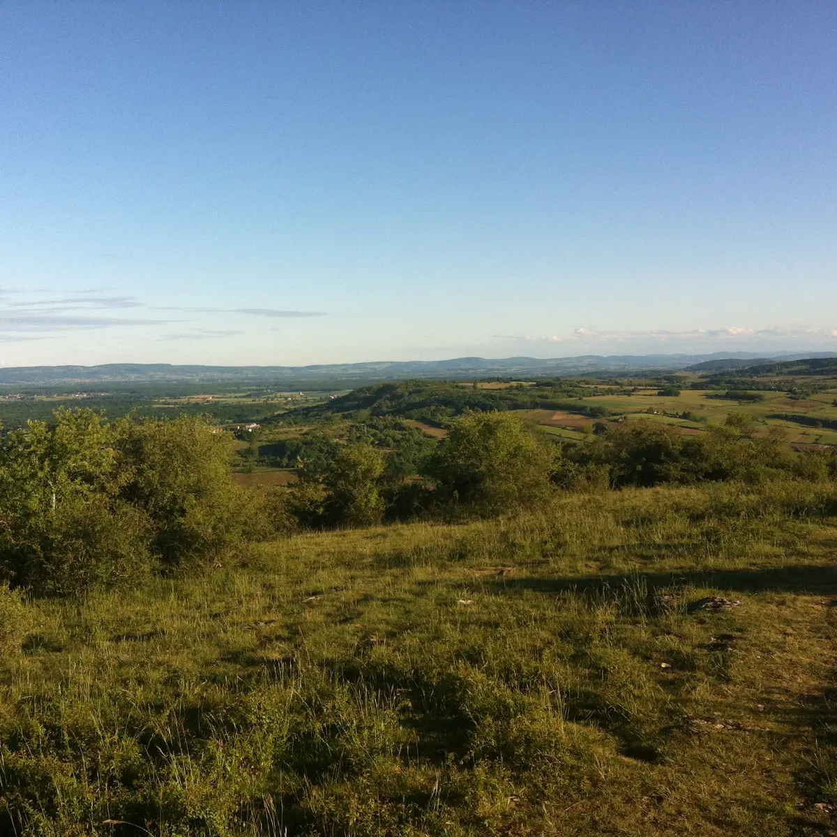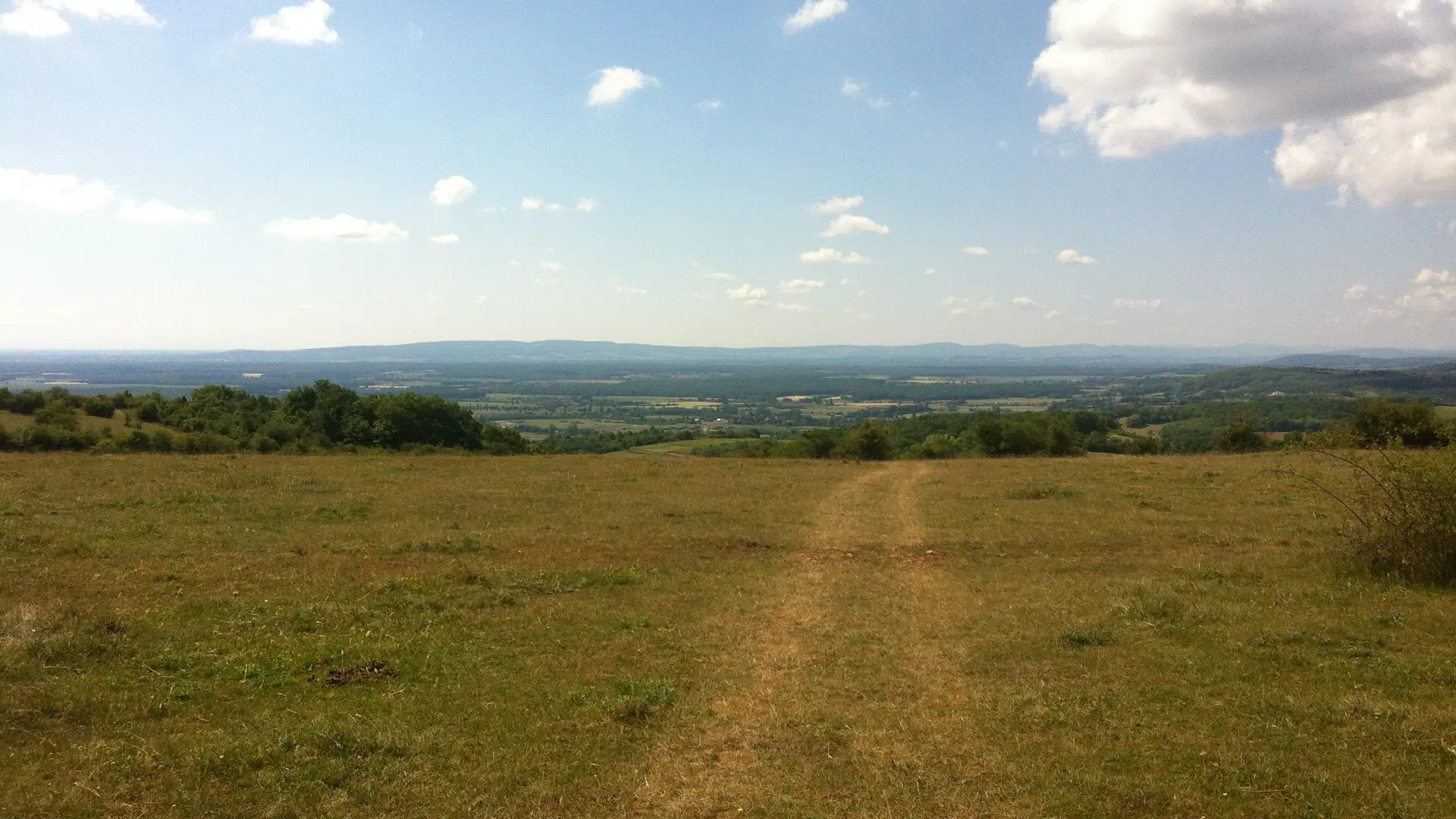 En (3), aux pancartes, prendre le sentier en pente raide qui monte à droite. Attention le terrain peu être glissant. Passer le portillon et bien le refermer. Vous êtes sur la chaume classée Natura 2000. Suivre le chemin qui longe la crête de la colline. Des paysages à 360° degrés s’offrent à vous. A gauche, la Vallée des Vaux. A droite la plaine de la Saône. A la borne en béton, vous passez par le point culminant de Givry, 447 m. Suivre le chemin en direction du nord est jusqu'au poteau 4 direction -chaume de Russily-