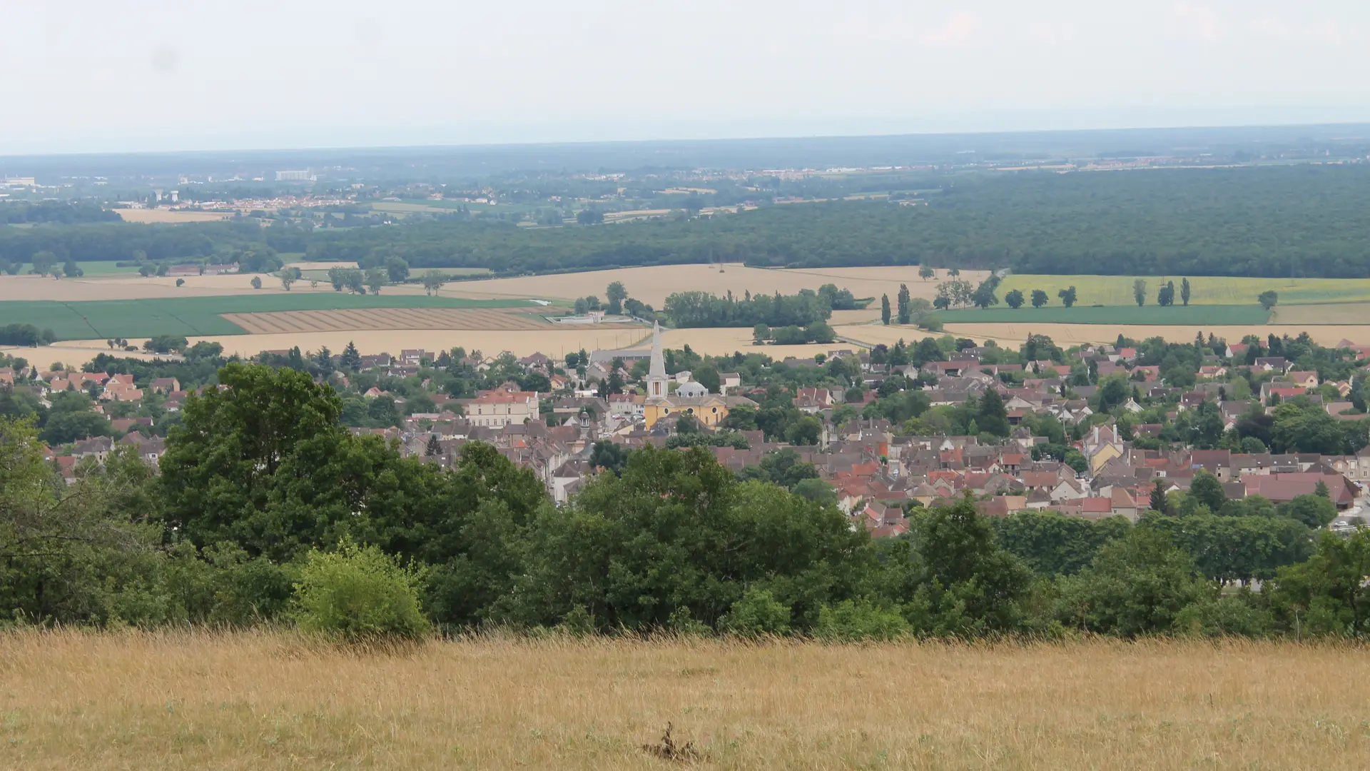 Tourner le dos au totem de départ, marcher sur 50 m et prendre le chemin en descente à droite après le peuplier bicentenaire. Aller jusqu'au bas du chemin, prendre à gauche puis à droite pour rejoindre la route. Descendre la route en direction de Givry et prendre à droite au calvaire. Suivre cette direction sur près de 200 m. En (1), prendre à droite le chemin qui monte en corniche et qui ouvre une jolie vue sur le vignoble puis un peu plus loin, après le bois, sur Russilly blotti dans son écrin de verdure.