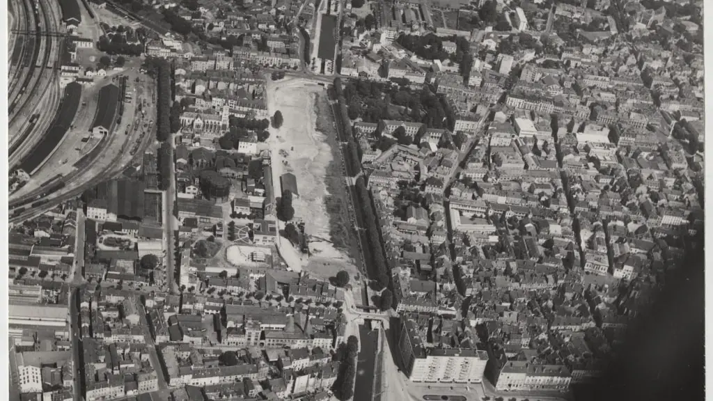 Août 1959, vue aérienne du bassin du Canal à Chalon-sur-Saône avant son comblement