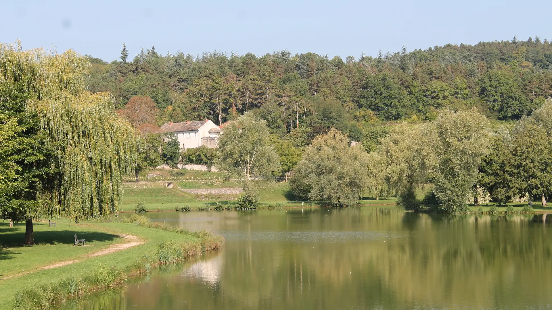 Contourner l’étang par le nord. Vous arrivez au lavoir (8) - Table d’interprétation. Poursuivre le tour de l’étang pour rejoindre la D978. Traverser la D978. Attention, route très passante. Prendre l’escalier en face et monter tout droit. Au croisement continuer tout droit. La route devient chemin et vous entrez dans un bois.